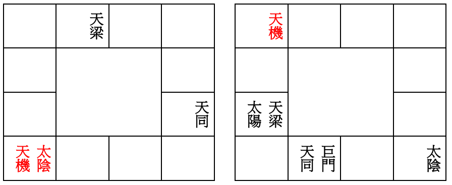 在丑未二宮的天機獨坐而正對天梁,而卯酉二宮的天機與天梁同宮,對宮為空 宮。在這兩個星系要注意的有: