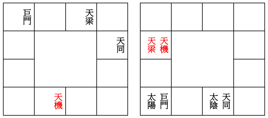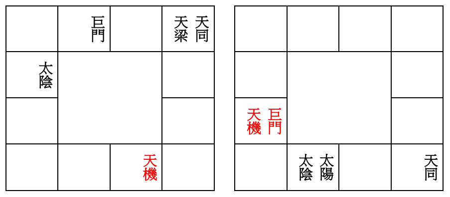 在子午二宮的天機獨坐而正對巨門,而卯酉二宮的天機與巨門同宮,對宮為空 宮。在這兩個星系要注意的有: